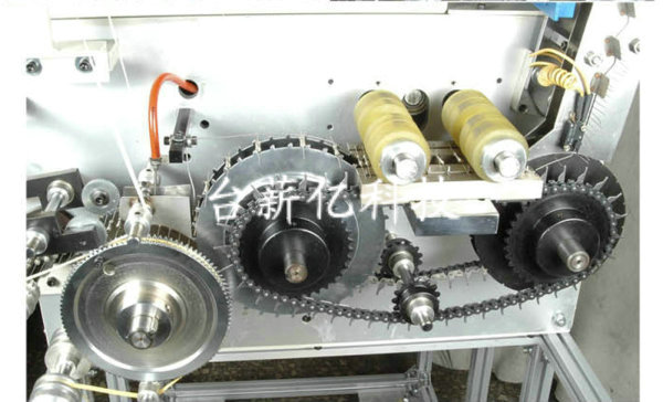 3)送料采用分度定位,間歇傳動輸入送鏈帶,兩道引直輪,可確保材料的直線度。